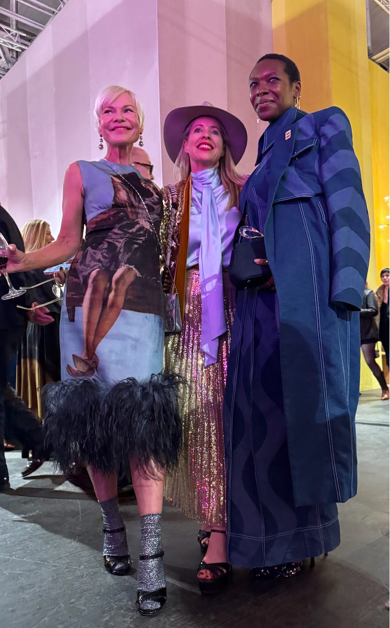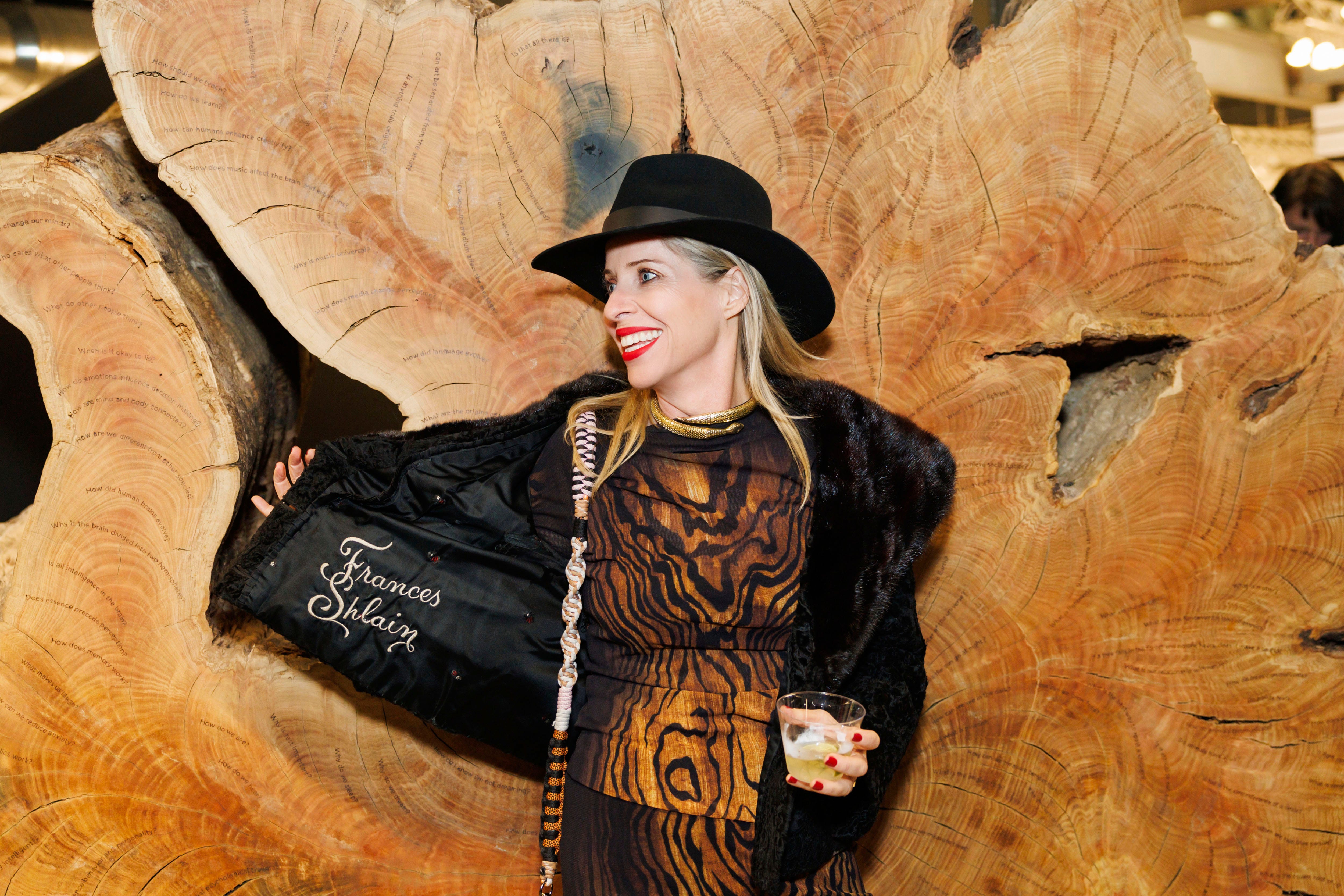 ps. Fashion is art to me. I love thrifting, finding anything unique. And because I was working so hard on this show in my studio, I enlisted Kelly Sparks, one of my best friends for over 30 years, to help me find something to wear for the opening, and miracle of miracles, she found me a wood print top and skirt! J’adore Kelly Sparks. And for this opening, I wore my late grandmother Frances Shlain’s coat with her name embroidered into the side. (Why don’t we do that anymore?) At this opening of Ancient Wisdom, all my ancestors, my grandparents, and my late father, Leonard Shlain were with me. Their ancient wisdom embedded and embroidered into my soul.