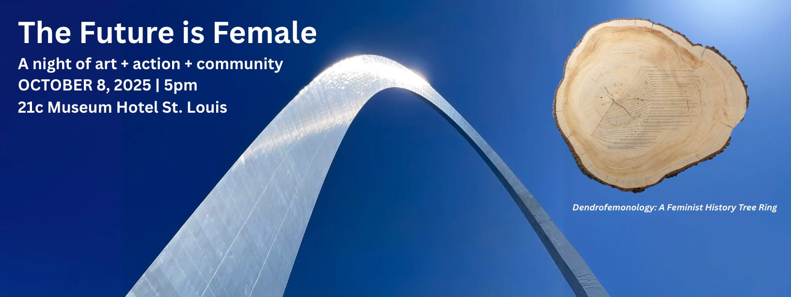 We are having a powerful night of feminist art & action on Oct 8th at the 21c Museum St. Louis exhibition The Future Is Female where my sculpture Dendrofemonology: A Feminist History Tree Ring is installed. Hosts are 21c, Dr. Nancy O’Reilly’s Women Connect4Good and Let It Ripple. Our aim is to bring the feminist history tree ring milestones to life by inviting women on the ground in St. Louis who are working to protect and expand women's rights to share what they are focused on. I will share highlights from the moveable monument’s journey so far (National Mall in DC, Madison Square Park, NYC and now St. Louis), and then moderate a panel with these amazing women below. The Poet Laureate of St. Louis will perform at the end. It will be a fantastic night. It’s free and open to the public to see the exhibition, reception, panel, and performance.