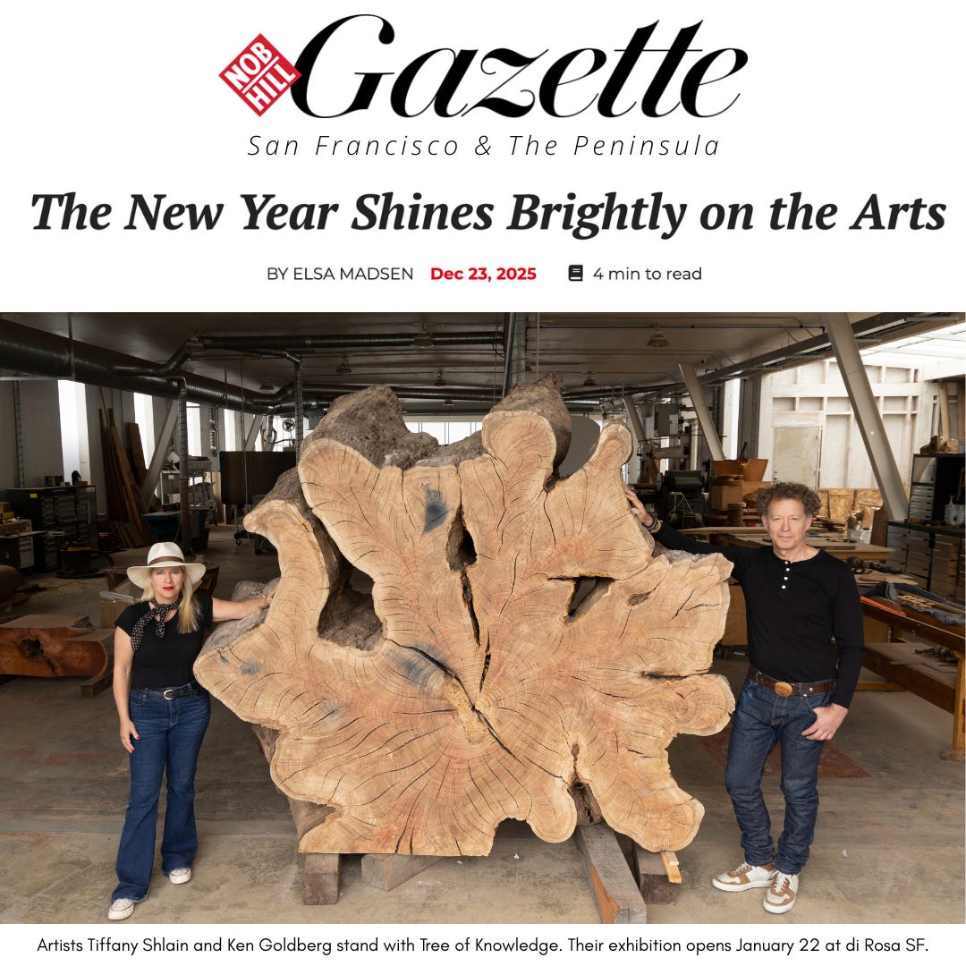 It was great to see Nob Hill Gazette feature our Tree of Knowledge artwork, 10,000 pounds and with nearly 200 questions in humanity’s quest for knowledge burned into the wood. An exciting piece of news is that this artwork will be on display at the atrium entrance at Minnesota Street Project also opening Jan 22. This is one block away from di Rosa’s new museum space. You can start at di Rosa and then head over to MSP one block away. We love the Minnesota Street Project and love how the show spans two great spaces. Minnesota Street Project is launching Atrium, a new alternative art fair showcasing small, emerging, and underground contemporary art galleries in the greater San Francisco Bay Area that opens that night the 22nd too. It’s a vibrant month for art in SF. You can see the Tree of Knowledge artwork that will be featured in the atrium entrance below.